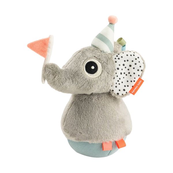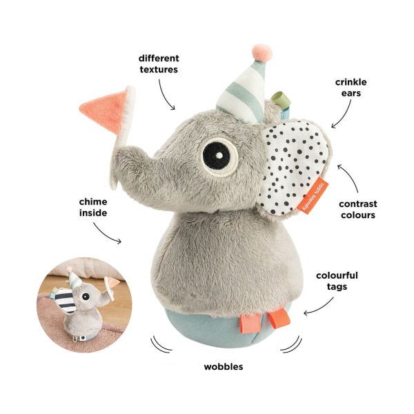 Elphee is gemaakt van zachte materialen en heeft verschillende structuren die de tastzin stimuleren. De oortjes maken een knisperend geluid en binnenin zit een subtiel belletje dat zacht rinkelt wanneer je kindje het speeltje aanraakt of duwt. De kleurrijke labeltjes nodigen uit om te grijpen en te ontdekken.