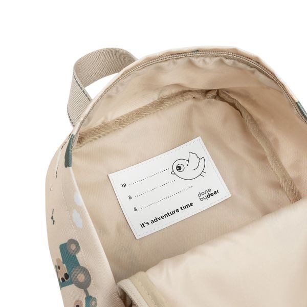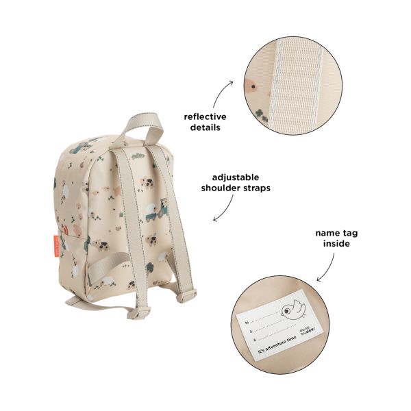 De Done by Deer Rugzak - Tiny Farm - Sand is perfect voor kleine avonturiers. Met het compacte formaat en het speelse design neemt je kindje moeiteloos spulletjes mee naar school, de opvang of een dagje uit. De rugzak heeft verstelbare schouderbanden voor een comfortabele pasvorm en is voorzien van reflecterende details voor extra zichtbaarheid. Het ruime hoofdvak en de zijvakken bieden voldoende opbergruimte en dankzij het naamlabel aan de binnenkant raakt de tas niet snel kwijt.