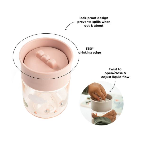 Dankzij de slimme 360° drinkrand kan je kleintje vanaf elke kant van de beker drinken, wat het overstappen naar een gewone beker vergemakkelijkt. De siliconen rand voelt comfortabel aan op de lippen en helpt bij het opbouwen van vertrouwen en zelfstandigheid tijdens het drinken. Bovendien voorkomt het lekvrije ontwerp ongelukjes en houd je alles netjes, thuis of onderweg.