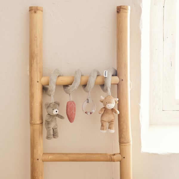 Je bevestigt de spiraal gemakkelijk dankzij de C-vormige sluiting – geschikt voor het ledikant, park, autostoeltje of kinderwagen. De combinatie van verschillende stoffen, pastelkleuren en verstelbare elementen stimuleert de tastzin en zintuiglijke waarneming van je kindje. De pieper, belletjes en rammelaar zorgen voor auditieve prikkels en extra fun.