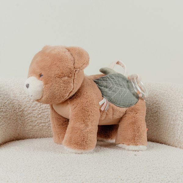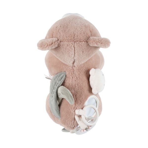 Met haar zachte materialen en speelse details nodigt Lily uit tot voelen, luisteren, kijken en ontdekken. De TPE-ring maakt haar makkelijk vast te grijpen, zelfs door kleine handjes. Verschillende texturen en labeltjes stimuleren de tastzin, terwijl geluiden zoals een belletje, knisperpapier en een zachte melodie de auditieve ontwikkeling ondersteunen. Ook bevat Lily een onbreekbare spiegel, een transparante rammelaar met kralen en een verstopvakje met een miniknuffel – perfect voor eindeloos speelplezier en verrassing.
