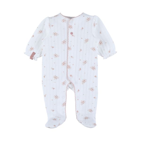 Deze schattige Noukie's pyjama combineert comfort met een verfijnde uitstraling. De zachte jersey stof met pointelle details en een subtiele bloemetjesprint zorgt voor een lieve look, dag en nacht. Dankzij de ademende stof en handige drukknoopsluiting aan de voorkant is de pyjama comfortabel én praktisch in gebruik. Het ontwerp biedt je baby voldoende bewegingsvrijheid en een fijne pasvorm.